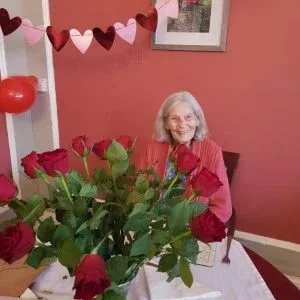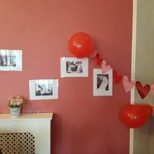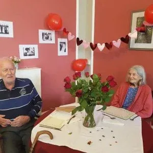 Staff and carers surprised the couple by decorating the dining room with heart-shaped bunting, confetti-filled balloons and a bouquet of beautiful red roses.